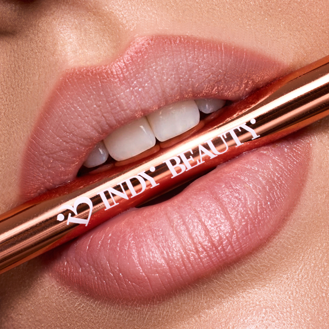 - Ustnice zapolni s šminko Indy Beauty v ujemajočem odtenku Blondie. Začni v sredini ustnic in potegni navzven.