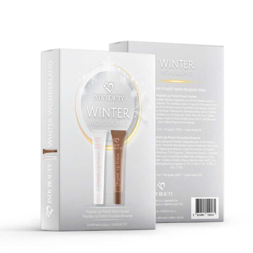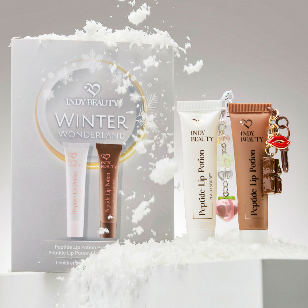 Set Winter Wonderland združuje dva Peptide Lip Potion balzama za ustnice – Peach Sorbet in Chocolate Brownie – popolno dvojico za vsak praznični trenutek.