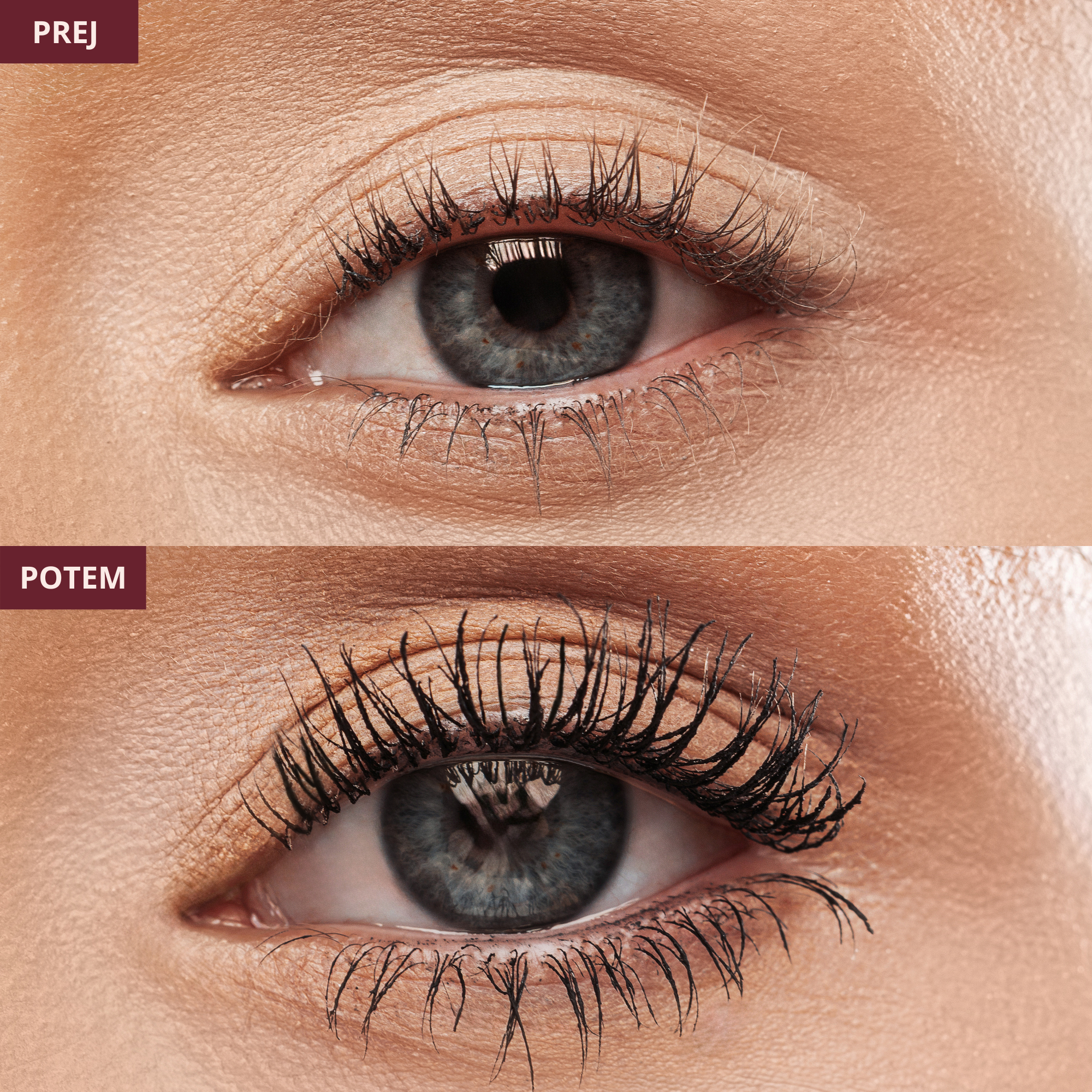Intenzivna črna barva poudari pogled, medtem ko se formula popolnoma prilagaja tvojemu tempu. Maskaro lahko plastiš, brez da bi povzročila lepljenje trepalnic ali občutek obteženosti.